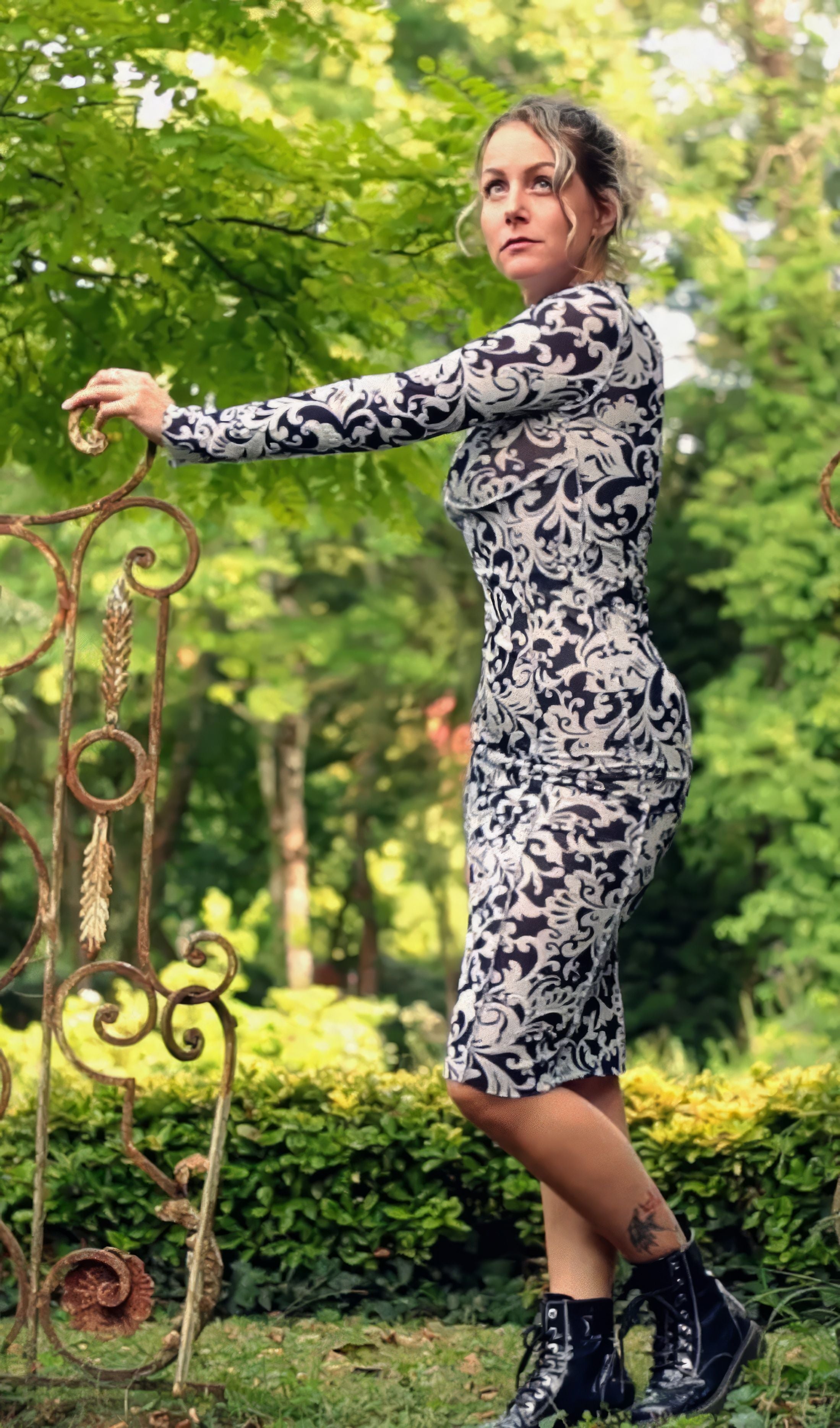 La robe "Lys Royal" est conçue pour la femme qui incarne l'élégance intemporelle et la distinction. Cette pièce affirme une sophistication sans effort, jouant sur le contraste graphique du motif pour créer une silhouette mémorable et structurée.